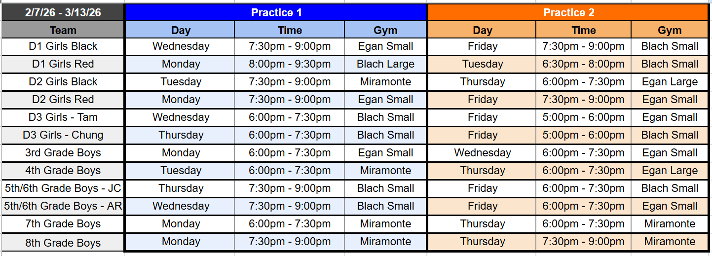 D1 and D2 Girls will be assigned to Team Black or Team Red, with team assignments based on skill